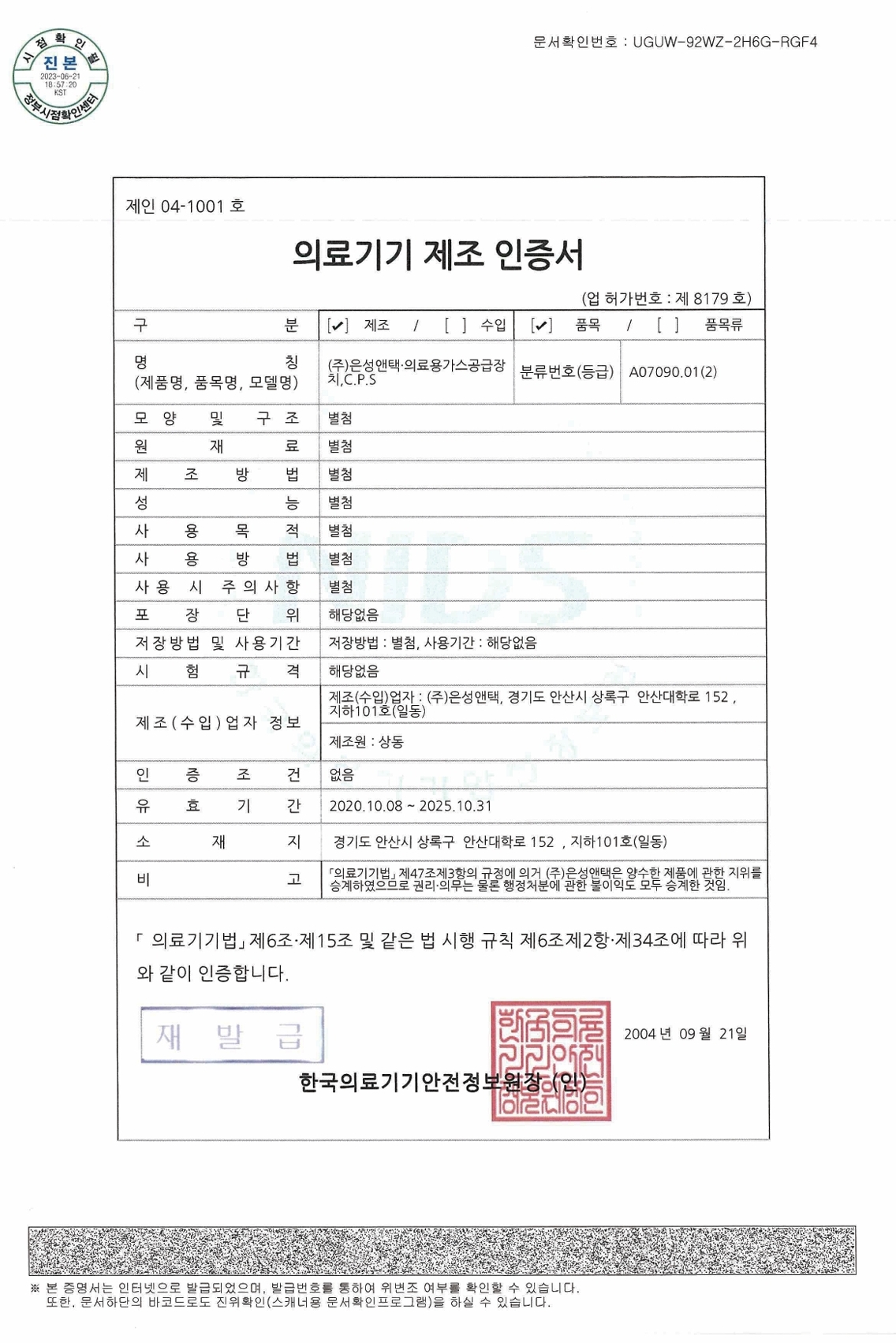 의료기기 제조 인증서